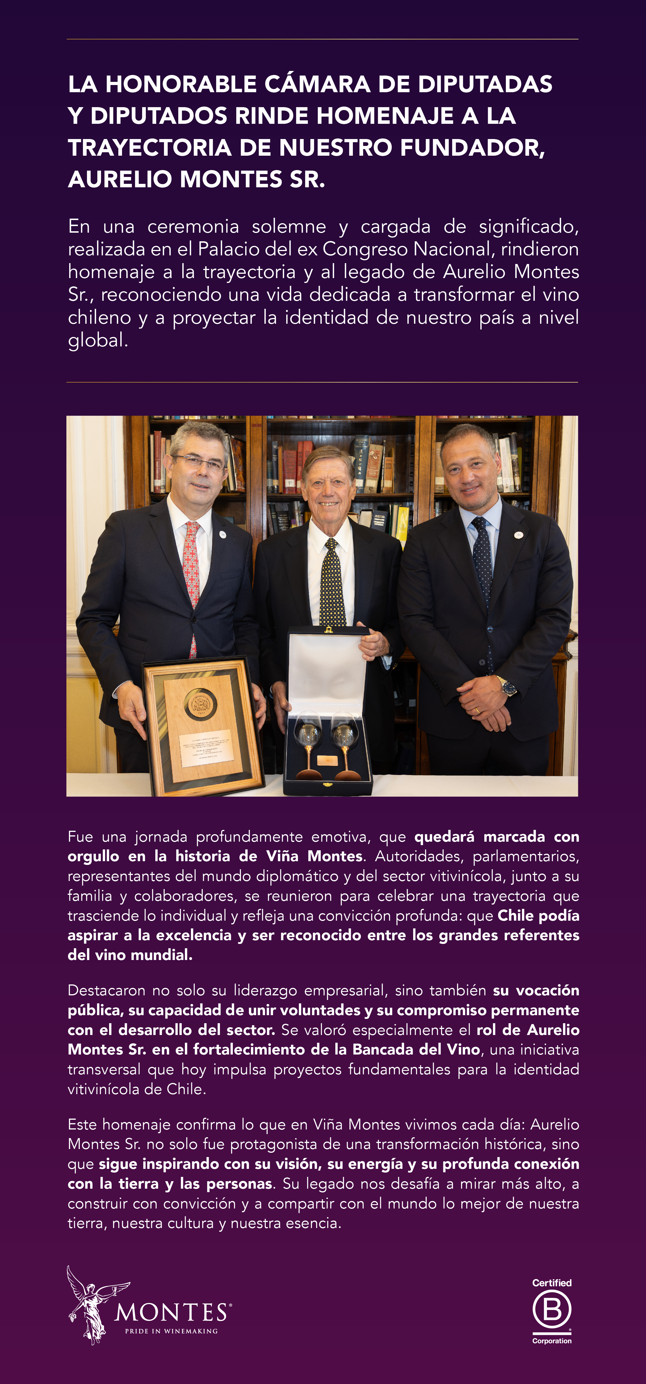 En una ceremonia solemne y cargada de significado, realizada en el Palacio del ex Congreso Nacional, rindieron homenaje a la trayectoria y al legado de Aurelio Montes Sr., reconociendo una vida dedicada a transformar el vino chileno y a proyectar la identidad de nuestro país a nivel global.<br/>Fue una jornada profundamente emotiva, que quedará marcada con orgullo en la historia de Viña Montes. Autoridades, parlamentarios, representantes del mundo diplomático y del sector vitivinícola, junto a su familia y colaboradores, se reunieron para celebrar una trayectoria que trasciende lo individual y refleja una convicción profunda: que Chile podía aspirar a la excelencia y ser reconocido entre los grandes referentes del vino mundial.<br/>Destacaron no solo su liderazgo empresarial, sino también su vocación pública, su capacidad de unir voluntades y su compromiso permanente con el desarrollo del sector. Se valoró especialmente el rol de Aurelio Montes Sr. en el fortalecimiento de la Bancada del Vino, una iniciativa transversal que hoy impulsa proyectos fundamentales para la identidad vitivinícola de Chile.<br/>Este homenaje confirma lo que en Viña Montes vivimos cada día: Aurelio Montes Sr. no solo fue protagonista de una transformación histórica, sino que sigue inspirando con su visión, su energía y su profunda conexión con la tierra y las personas. Su legado nos desafía a mirar más alto, a construir con convicción y a compartir con el mundo lo mejor de nuestra tierra, nuestra cultura y nuestra esencia..