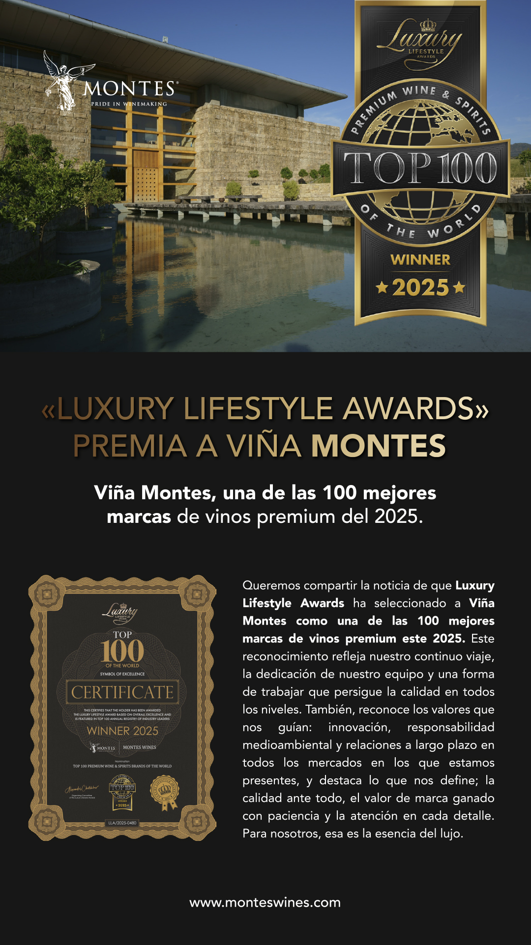 Queremos compartir la noticia de que Luxury Lifestyle Awards ha seleccionado a Viña Montes como una de las 100 mejores marcas de vinos premium este 2025. Este reconocimiento refleja nuestro continuo viaje, la dedicación de nuestro equipo y una forma de trabajar que persigue la calidad en todos los niveles..
