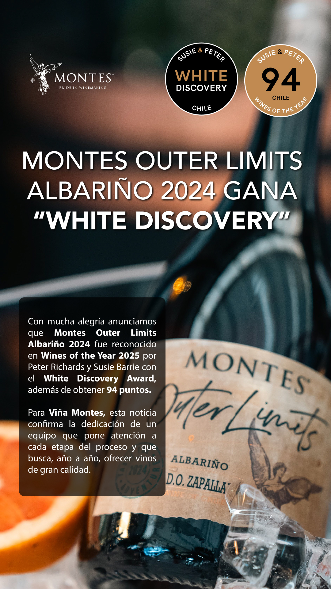 Con mucha alegría anunciamos que Montes Outer Limits Albariño 2024 fue reconocido en Wines of the Year 2025 por Peter Richards y Susie Barrie con el White Discovery Award, además de obtener 94 puntos. Para Vifia Montes, esta noticia confirma la dedicación de un equipo que pone atención a cada etapa del proceso y que busca, año a año, ofrecer vinos de gran calidad..